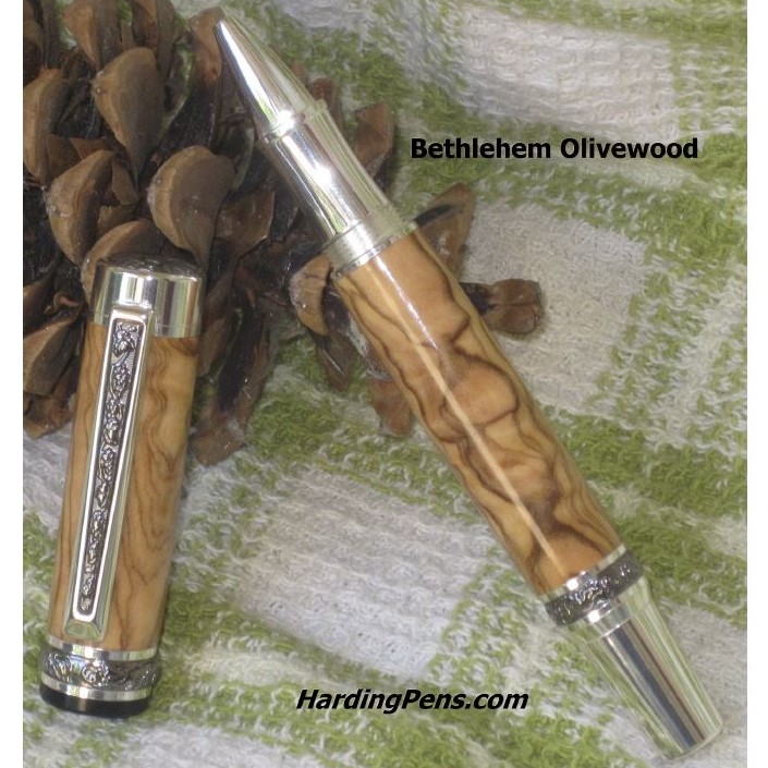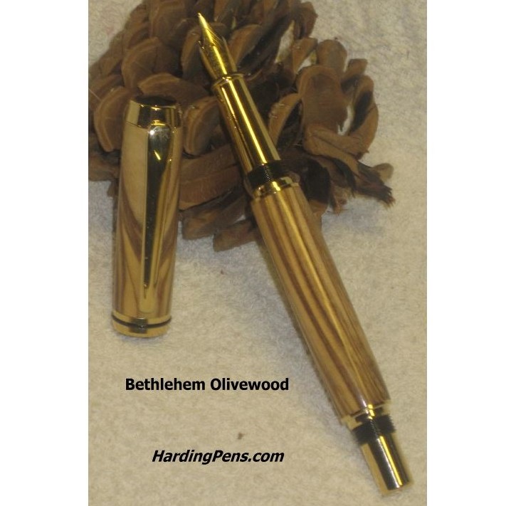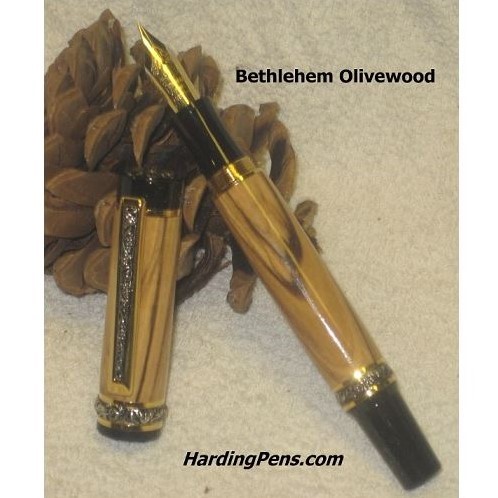 The Cambridge pen is a beautiful writting instrument available as a fountain pen or as a rollerball pen. The one shown is a fountain pen type, made with Bethlehem Olivewood. This pen uses premium hardware platings such as sterling silver and titanium-gold.