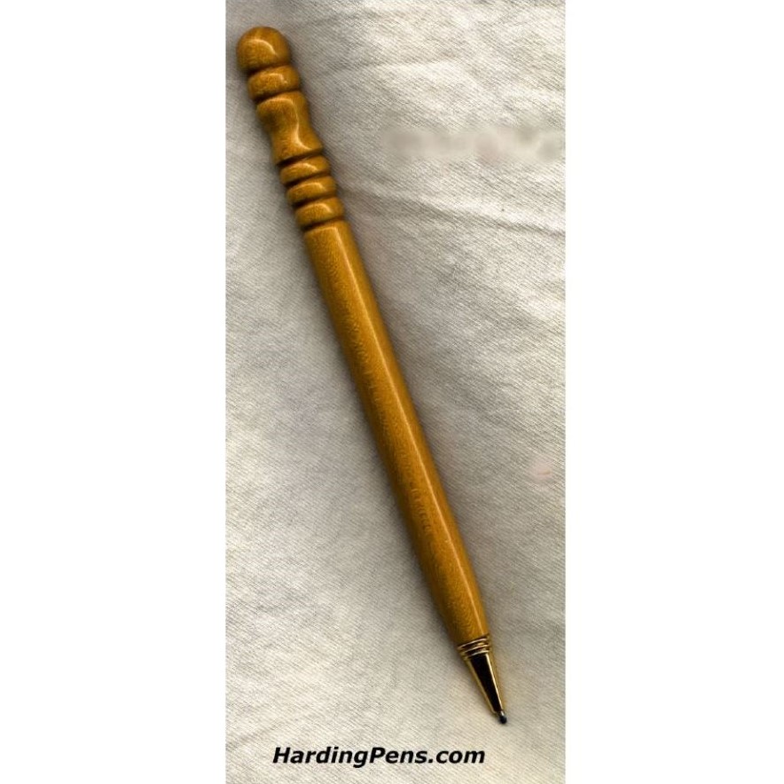 This type of pen is alway ready, the ink tip does not retract. Typical of pens in a bank or other desk application. This one is decorated with ornate shapes in the Osage Orange hardwood. The tip is 24 karat gold plated. The pen uses a Cross type ink refil. This pen is often done with different shapes on the end since it has a wood body and no cap. I can make a stand for these pens too. I sometimes do these in pairs with one stand for weddings.